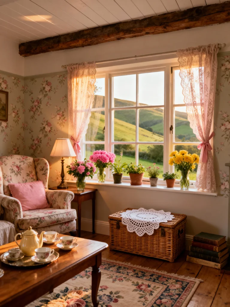 Look at this window! It’s pure magic, isn’t it? The way the late afternoon sun streams through those delicate, lacy pink curtains just bathes the whole room in a warm, golden glow. This space perfectly captures the essence of a serene cottage retreat. I adore the mix of textures: the soft floral armchair, the rustic wooden beam above, and that charming wicker trunk topped with a crocheted doily. And seriously, can we talk about the view? Rolling green hills right outside your window—it feels like a painting! It’s all about that cozy, slightly vintage comfort, where everything is perfectly placed for a moment of peace and a nice cup of tea.