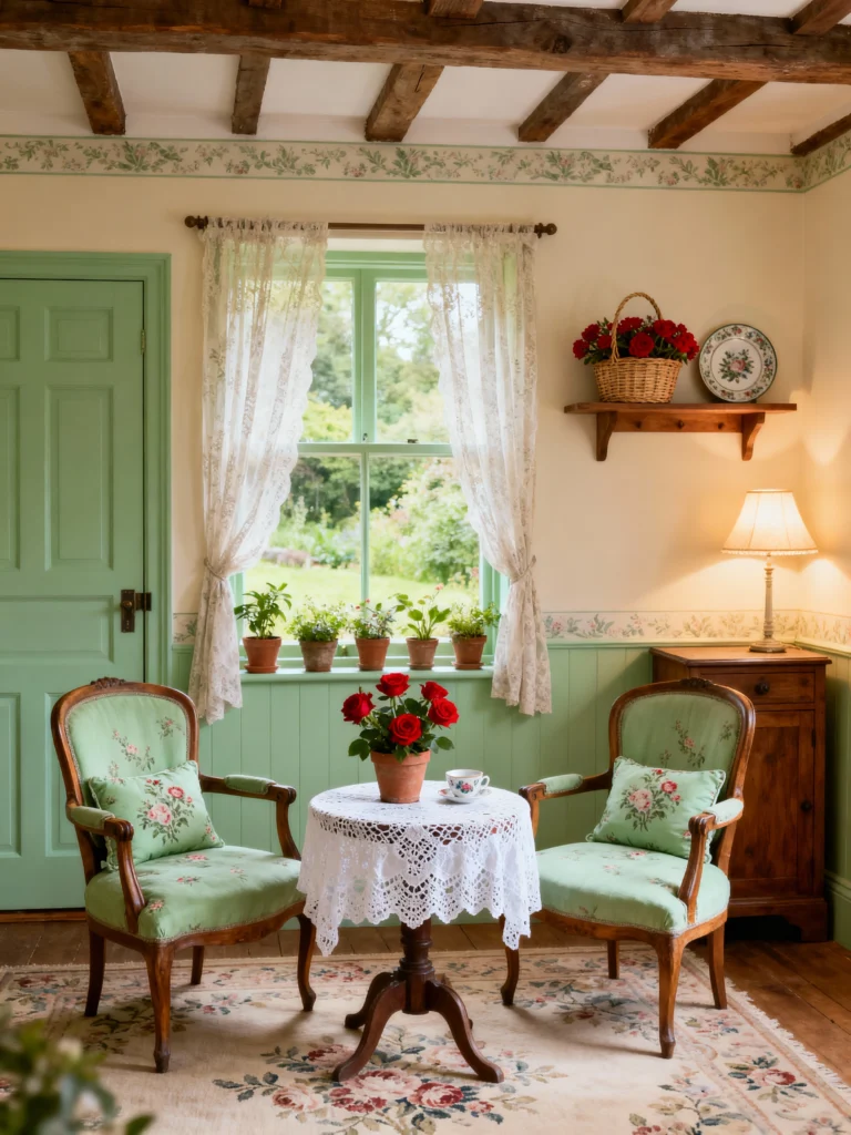 This room is so soothing! The combination of the mint green wainscoting and door with the warm wooden furniture is just divine. It feels incredibly balanced and peaceful. The beautiful lace curtains let in a gentle light, perfect for that sweet little table set for two. I’m especially fond of the rose-printed upholstery on those antique-style chairs—it’s a sophisticated take on the floral theme. This corner feels like a bright, quiet sanctuary, perhaps for a morning coffee or a cozy, intimate conversation. Plus, the little row of potted herbs on the windowsill adds a fresh, country feel!