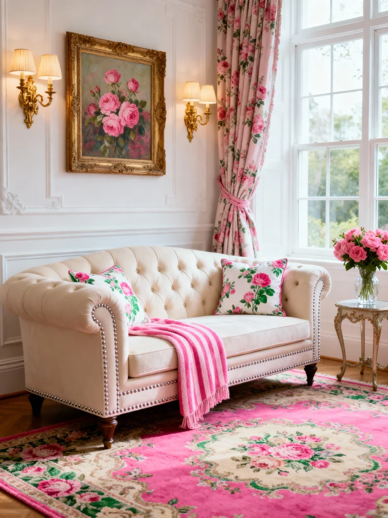 Now this is how you do floral with a touch of luxury! Unlike some of the cozy cottage looks, this room is pure glamour. That creamy, tufted sofa is stunning, with the nailhead trim adding a beautiful structure. The focal point, however, has to be that bold, magenta-and-cream floral rug—it completely anchors the space with vibrant color. The painting of the pink roses above the sofa is a perfect match, tied together with the matching curtains. The gold sconces add an old-world elegance, making this spot feel like a very chic and sophisticated corner for a quiet chat or a glass of champagne.