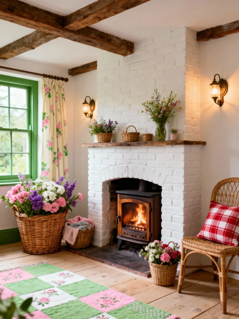 This is the ultimate cozy cottage vibe! The white brick fireplace and rustic wood-burning stove are instantly inviting, especially with the glowing fire. I love the exposed wooden beams and the vibrant splash of green from the window frame—it ties the inside to the natural beauty outside. But the real star is the sheer abundance of flowers! The huge basket overflowing with summer blooms next to the rattan chair just brings so much texture and life to the room. The cheerful, checkered rug on the wooden floor adds a pop of modern color. It’s the perfect mix of rustic comfort and floral freshness.