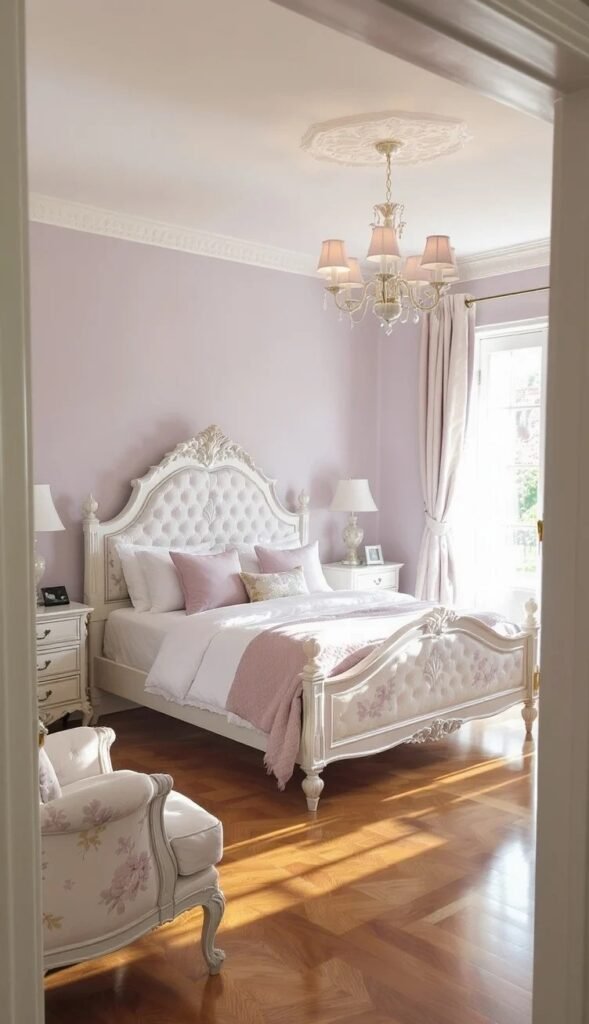 the soft lilac walls and those stunning carved, tufted pieces give the room such a delicate, romantic feel. The light filtering in is beautiful, highlighting the warm wood floor. That elaborate medallion ceiling and the crystal chandelier really nail that luxurious, old-world charm. It’s like sleeping in a fairytale!