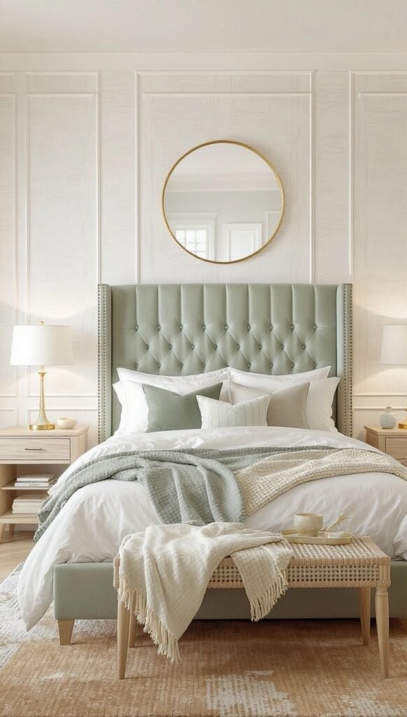 This is the perfect palette for someone who loves calm. The soft mint-green headboard i works beautifully against the crisp white wall paneling. The light, woven bench and simple wooden nightstands add a touch of airy, natural texture. The whole space feels like a breath of fresh air—minimalist, sophisticated, and incredibly tranquil.