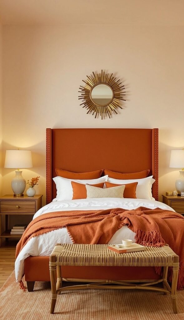 That incredible burnt-orange headboard and coordinating throw instantly grab your attention and make the room feel so cozy. The sunburst mirror is a fantastic touch, adding a playful, bohemian energy. It’s a wonderfully vibrant yet grounded space, perfect for unwinding after a long day.