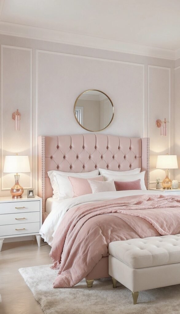 I love the subtle glamour in this look from image. The soft dusty rose velvet headboard is gorgeous, and the rose-gold accents on the lamps and wall sconces are spot-on. Paired with crisp white furniture and that luxurious shaggy rug, it feels incredibly chic. It’s the perfect blend of softness and sophistication.