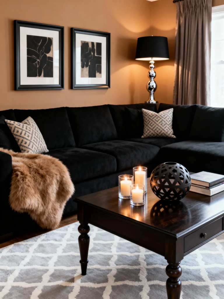 What a fantastic way to do a dark sofa without the whole room being super moody! Based on the image, the warm, terracotta-toned accent wall is such a beautiful backdrop for the black sectional. It brings an earthy, grounded feel to the space. The light gray, patterned rug keeps the floor bright, and the sheepskin throw adds a touch of cozy texture. It’s the perfect balance of bold and comfortable—a great setup for an evening in!