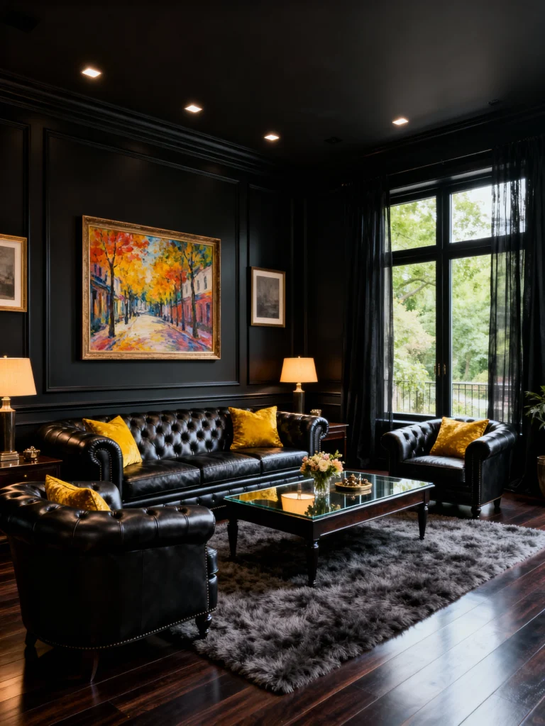 Talk about a power move! This room is the ultimate masterclass in high-end, moody design. The deep, rich black paneled walls and ceiling, combined with the glossy dark wood floors, create this incredible, enveloping space. Seriously, who wouldn’t want to sink into those tufted black leather Chesterfield sofas and chairs? The pops of mustard-yellow velvet pillows and that vibrant street scene painting are genius—they cut through the darkness with just the right amount of warmth and energy. It’s chic, dramatic, and instantly feels like a sophisticated retreat. The textured grey rug and sheer black drapes complete the look, proving that monochromatic is anything but boring.