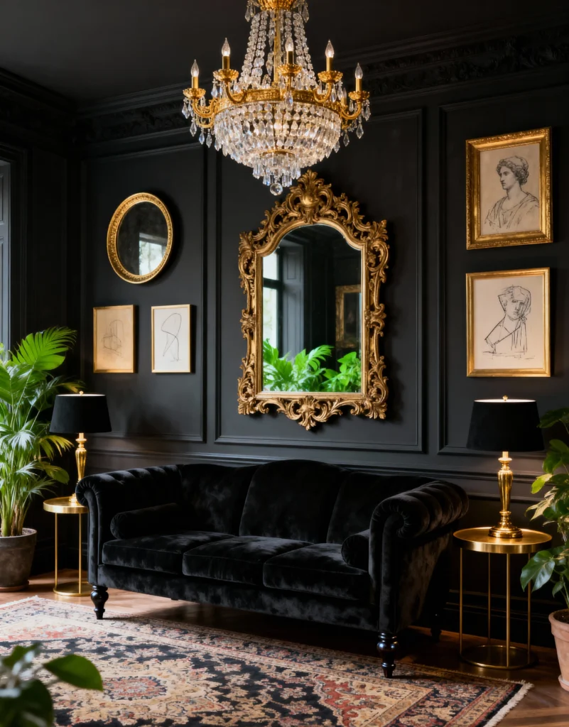 This space uses black as a dramatic canvas to let the gold accents truly shine. Based on the image, the intricate paneling on the walls adds an architectural elegance, but the showstopper is absolutely the dazzling crystal chandelier and the huge, ornate gilded mirror. Notice how the plants breathe life into the dark corners. The black velvet sofa looks plush and comfortable, perfectly balancing the historic, formal feel with luxurious texture.