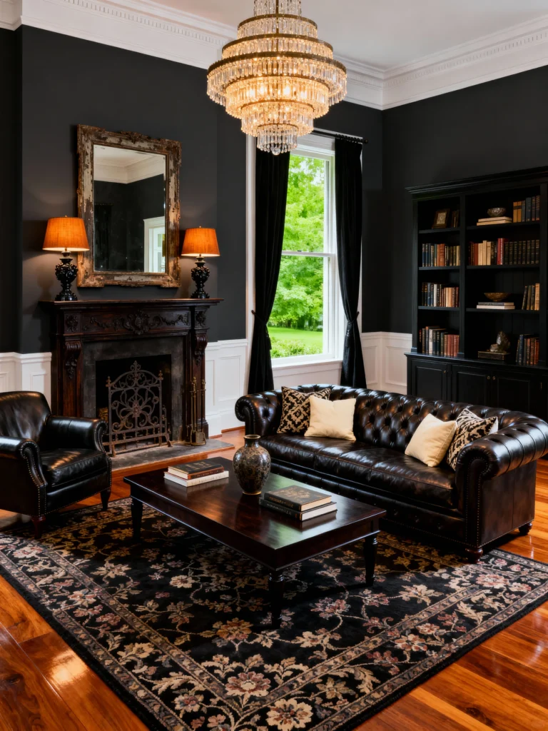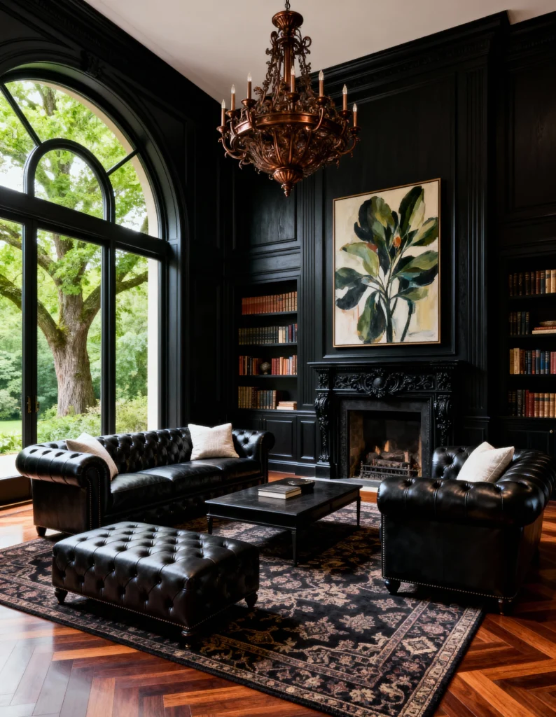 Here’s another great example of mixing deep tones with classic, luxurious details. Based on the image, the room centers around that beautiful, aged fireplace—it has so much character! The black leather tufted sofa and accompanying armchair are traditional choices that bring in a rich texture. I love how the warm wood tones in the floor and the coffee table contrast with the charcoal walls, while the stunning chandelier adds a touch of brightness and sparkle.