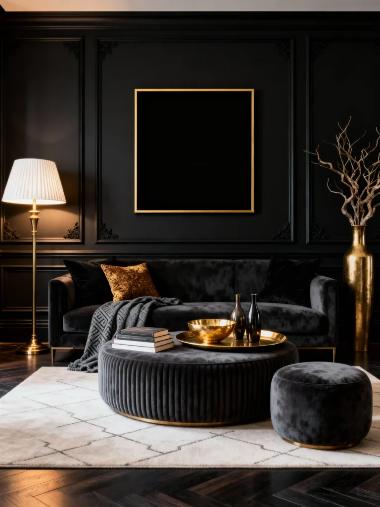 If you want a room that feels both high-fashion and incredibly intimate, take notes! This space is all about texture and clean lines. The black velvet sofa and the ribbed, upholstered ottoman create a tactile experience. The use of gold is deliberate and sophisticated—a simple floor lamp and a tray with metallic accents. The blank gold-framed art keeps the focus on the furniture and accessories. It’s minimalist luxury at its best.